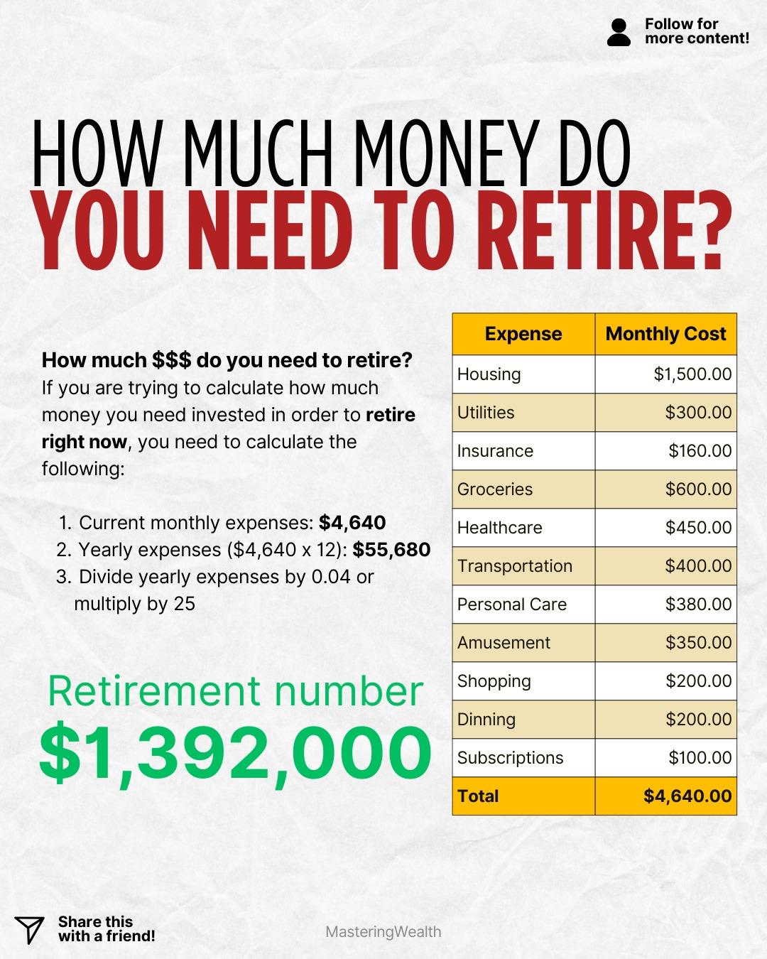 In this example the monthly expenses are four thousand six hundred forty dollars which adds up to fifty five thousand six hundred eighty dollars per year. When you multiply that number by twenty five you get a retirement number of one million three hundred ninety two thousand dollars. This number represents how much money you would need invested so that a four percent withdrawal rate could support your lifestyle.