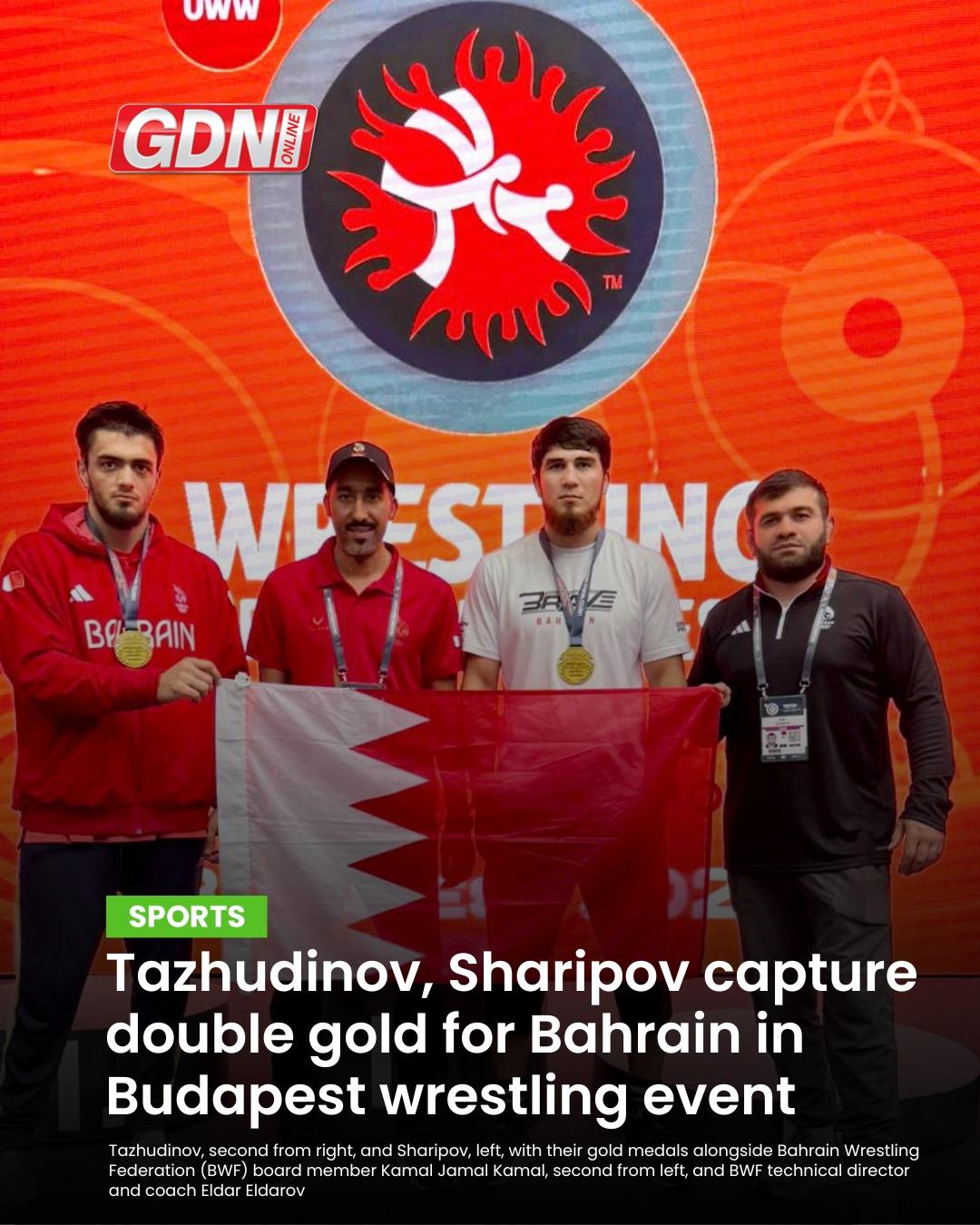 • World and Olympic champion Akhmed Tazhudinov struck gold this evening to spearhead a sensational title double for Bahrain in a top international wrestling competition in Budapest, Hungary.